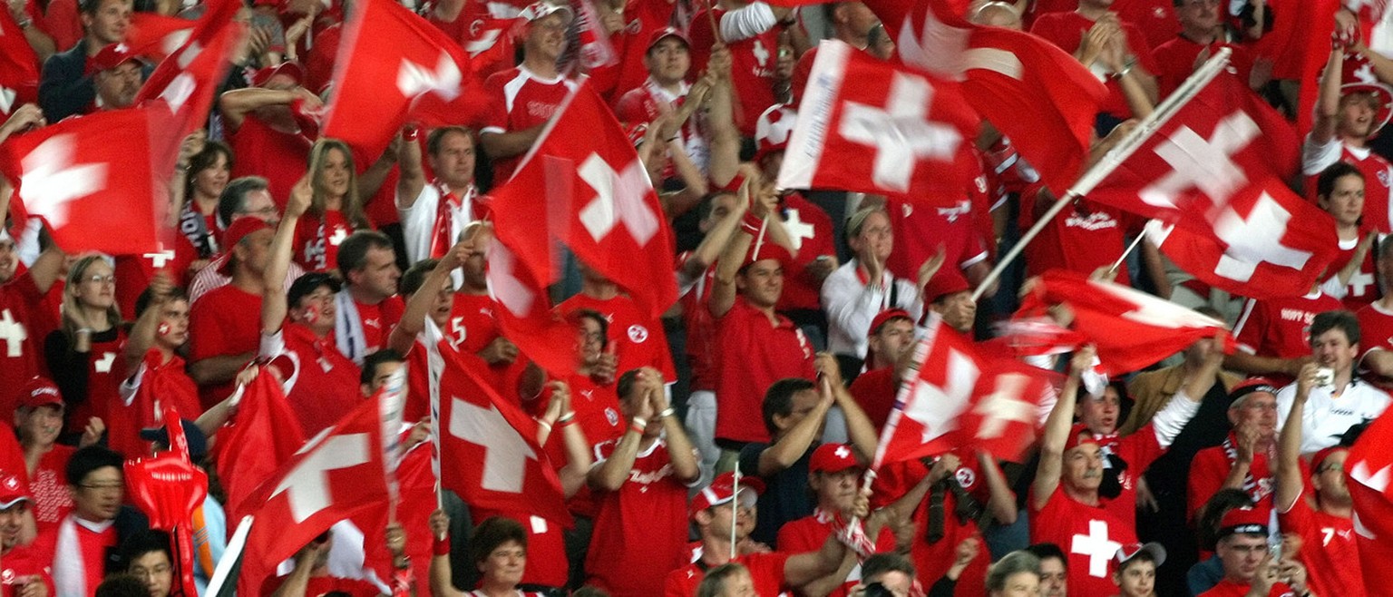 Description : Swiss soccer fans wave flags